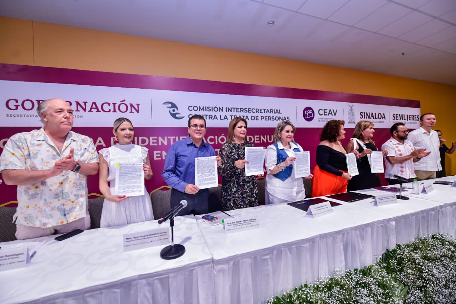 En el evento estuvieron presentes Fabiola Alanis Sámano, Comisionada Nacional para Prevenir y Erradicar la Violencia contra las Mujeres; la Doctora María Teresa Guerra, Secretaria de las Muejres del Estado de Sinaloa y la Doctora Eneyda Rocha Ruiz, Presidenta del DIF Sinaloa, en representación del Gobernador Rubén Rocha Moya, quien aseguró que desde el Gobieno de Sinaloa se coordinan esfuerzos con Municipios y Federación para atender la trata de personas, sobre todo la explotación laboral infantil.