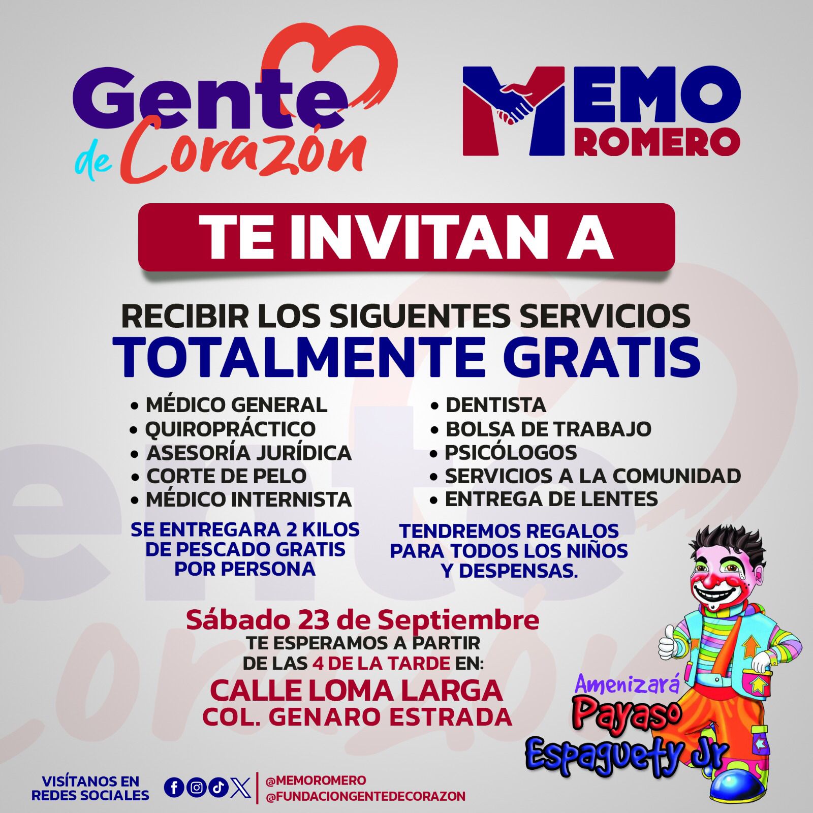 Este sábado 23 de septiembre, la fundación Gente de Corazón estará ofreciendo servicios gratuitos de salud a todos los habitantes de asentamientos aledaños a la colonia Genaro Estrada. A partir de las 4 de la tarde en el parque infantil por la calle Loma Larga. Memo Romero, estará en dicha jornada de salud.